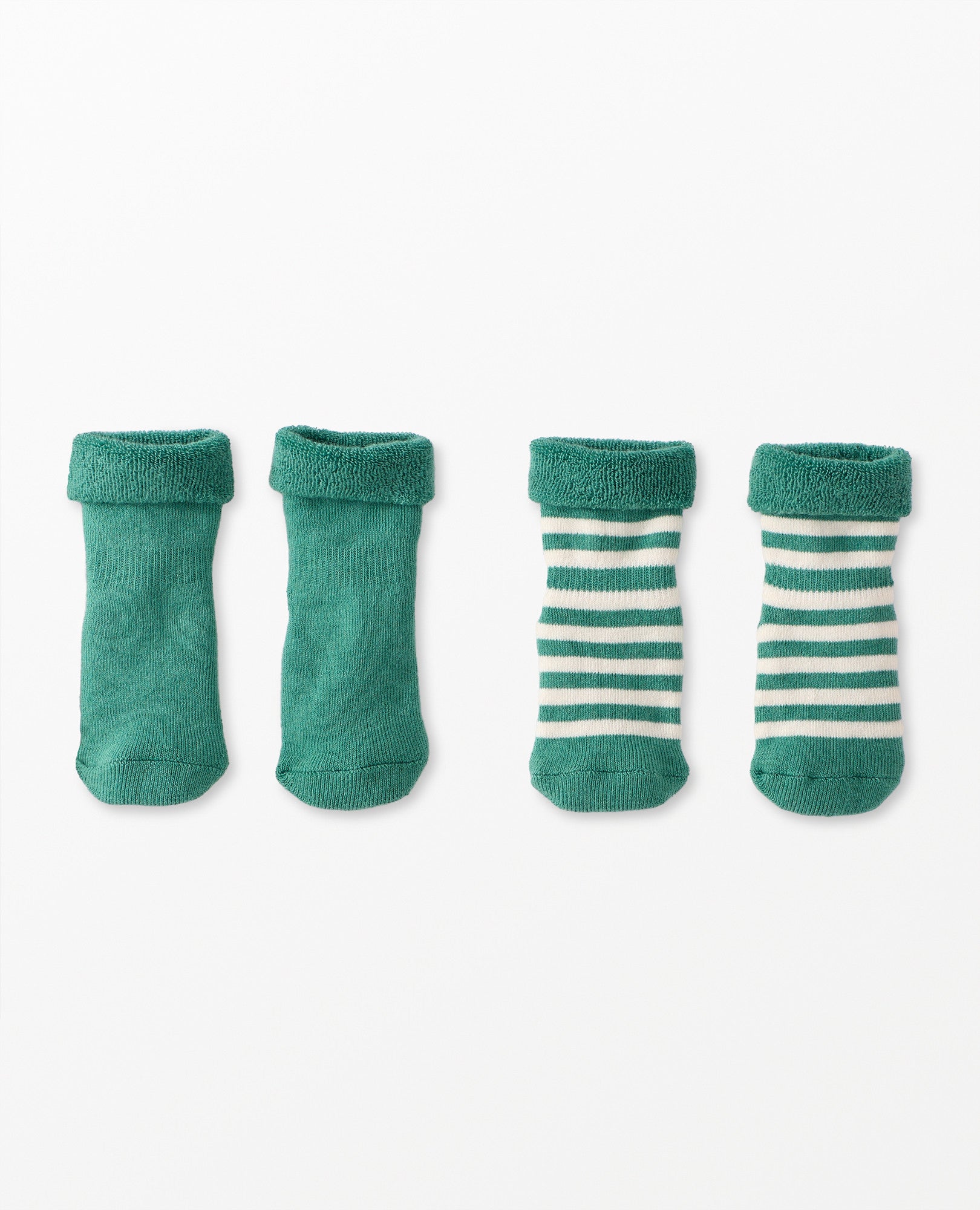 One green pair and one green and white striped pair of cozy baby socks, beautifully knit in Europe with hand-me-down quality in every detail that's just right for baby.
