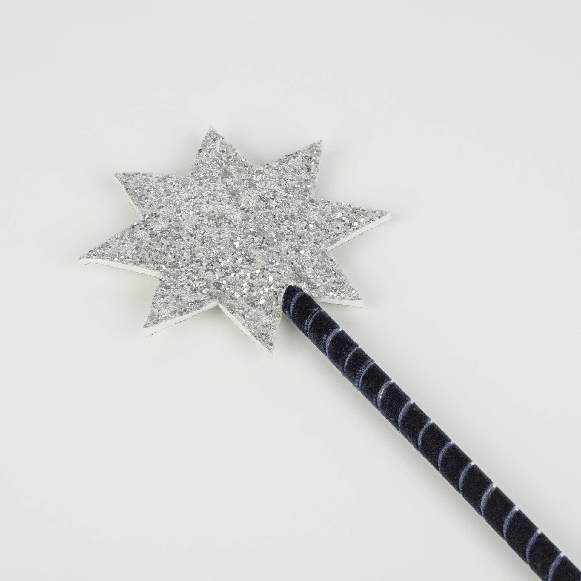 * The wand is topped with a silver glitter fabric star, and has a blue velvet ribbon wound around the wooden handle