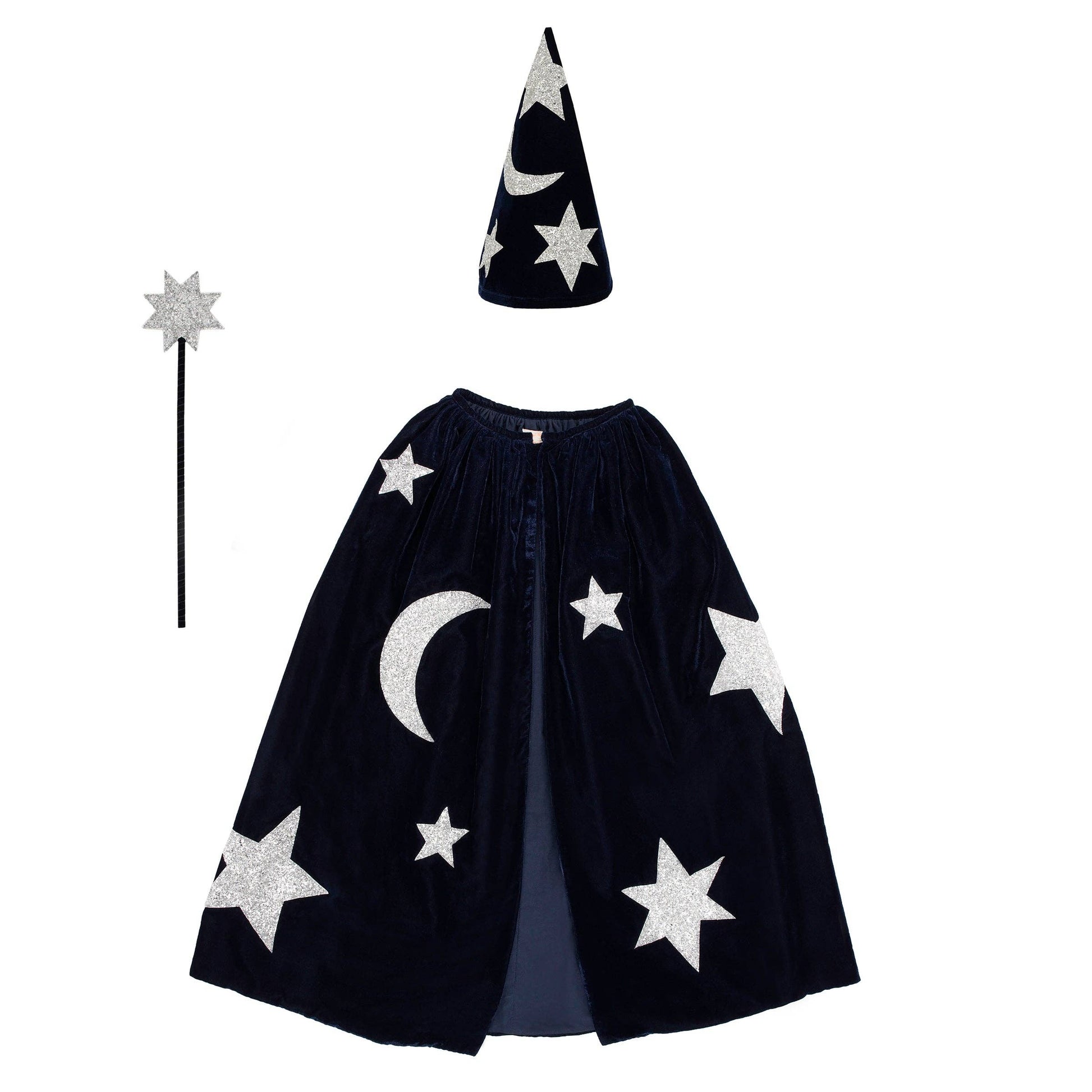 * Blue velvet cape, with silver glitter fabric moons and stars, with a cotton lining