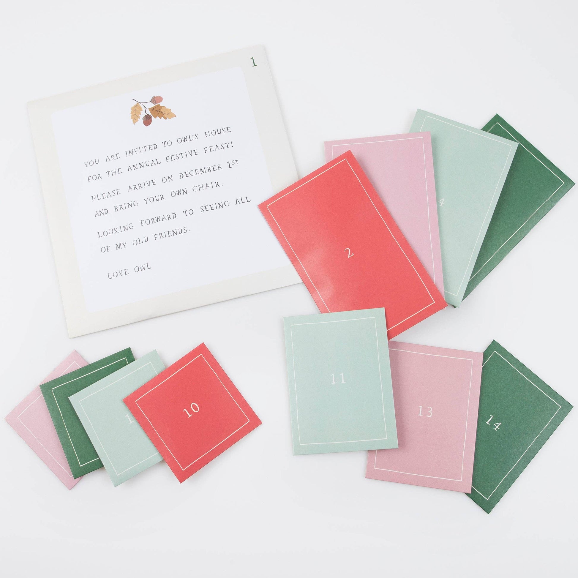 * The beautifully printed and laminated box contains a folded paper backdrop, to set the festive scene, and 24 numbered and different sized envelopes
