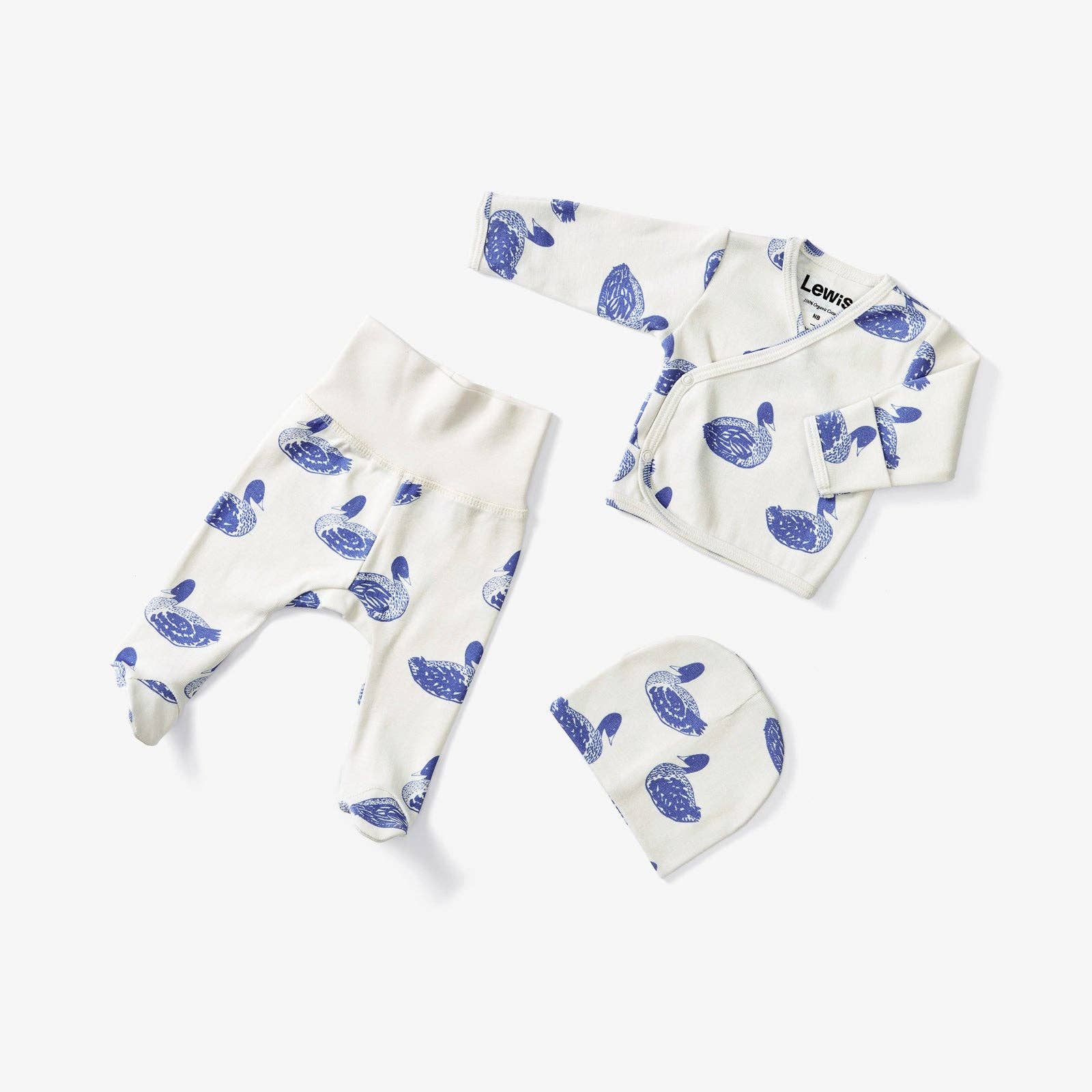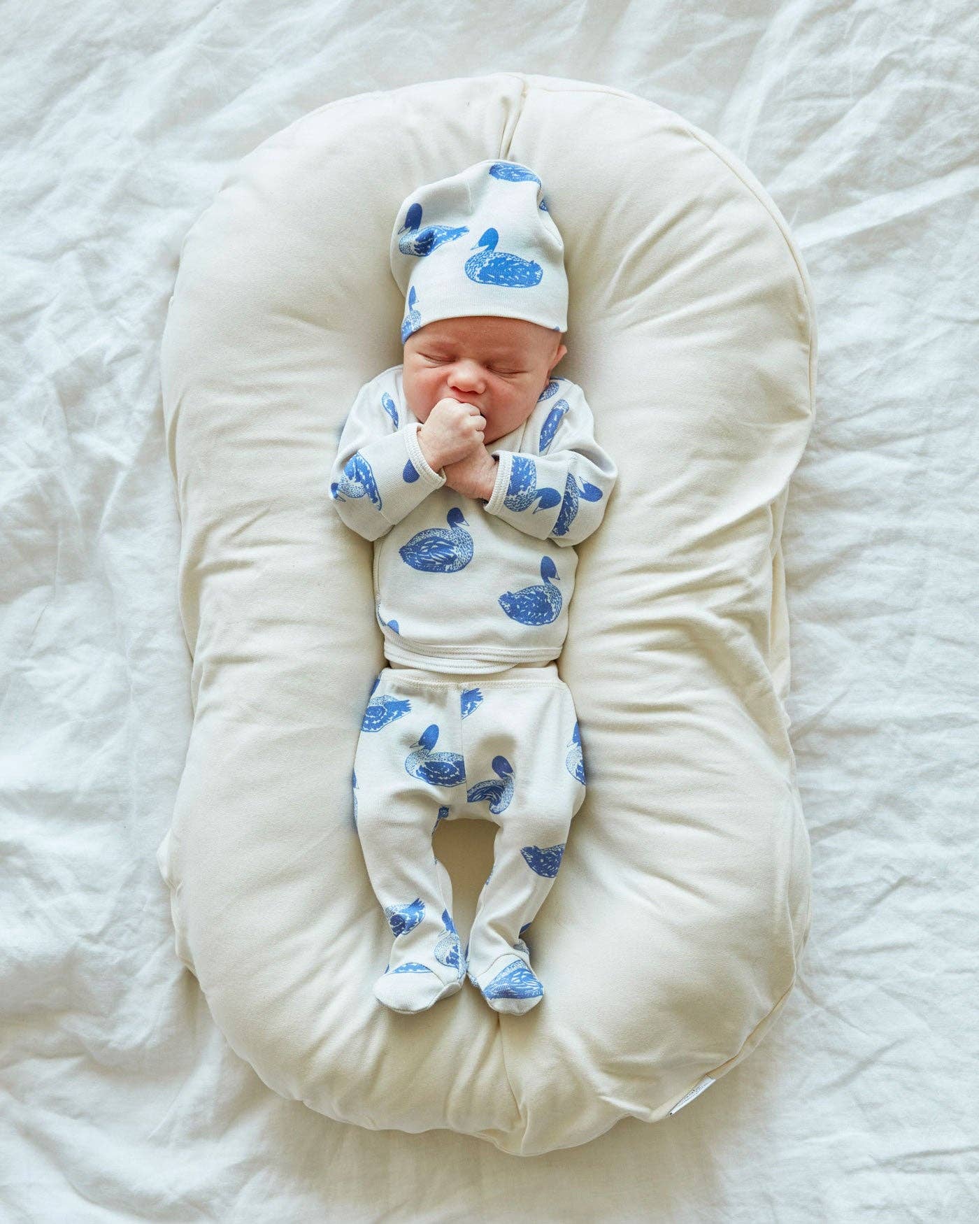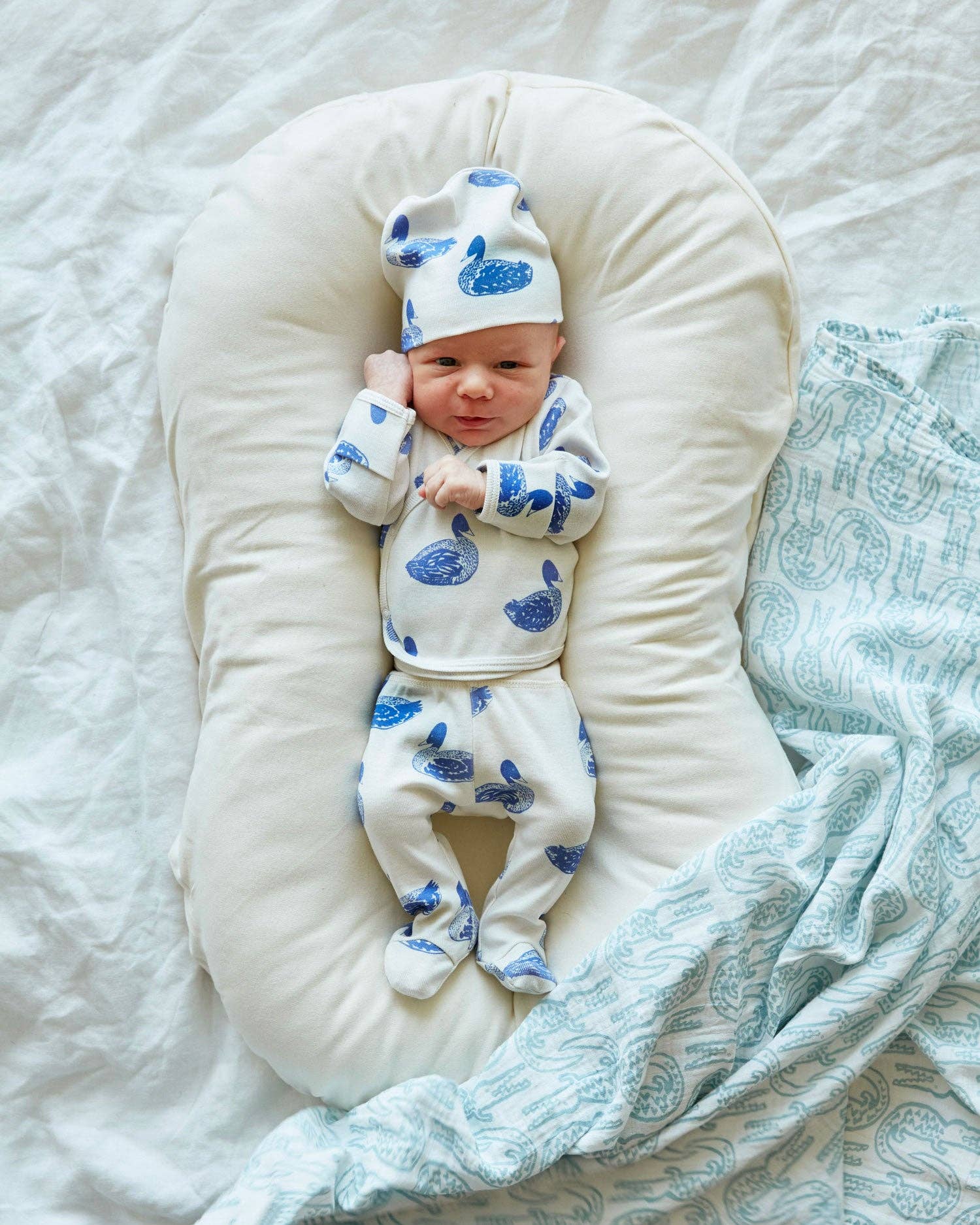 This is the sweetest set for the littlest little. We've updated this fan favorite a bit to make it even better. The wrap-style top with hand-covers snaps on the side to avoid baby’s sensitive belly button. The pant has a new wider, soft waistband that goes nice and high on baby's belly. The footed pant + hat help keep baby extra warm. Now in more than one size for longer use!
